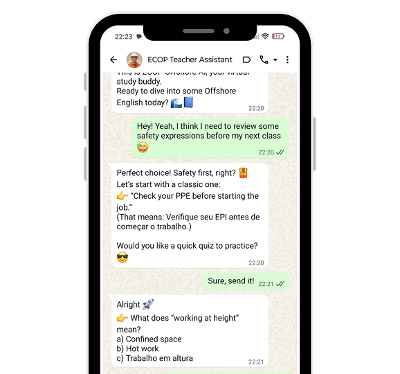 Com a IA da ECOP Offshore, você treina a fala, a escuta e o vocabulário técnico de forma prática, natural e personalizada.